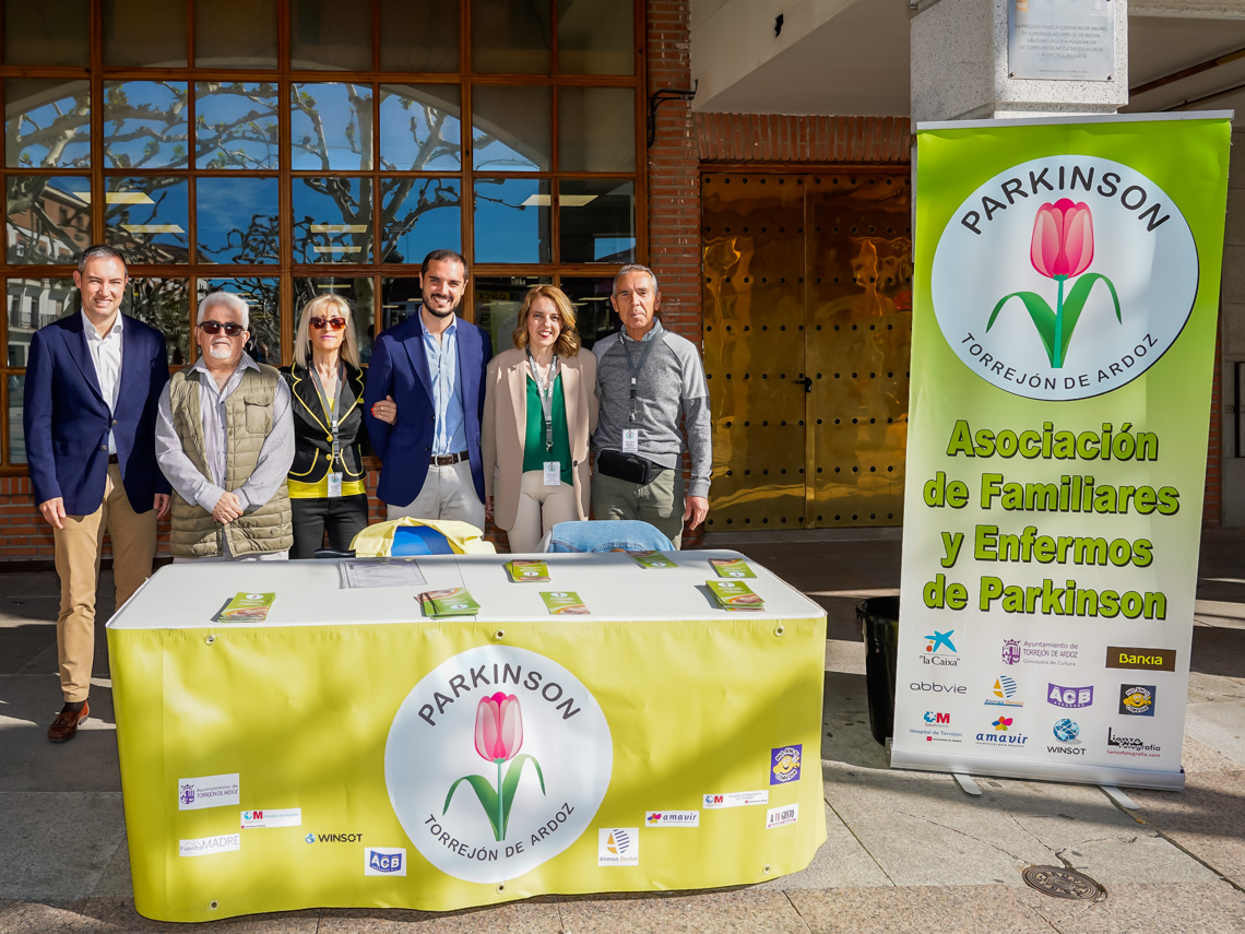 Torrejón de Ardoz se suma a la celebración del Día Mundial del Parkinson que está teniendo lugar hoy 11 de abril en todo el mundo. Con motivo de esta jornada, la Asociación de Familiares y Enfermos de Parkinson de la ciudad, en colaboración con el Ayuntamiento, ha organizado diferentes actividades con el objetivo de informar y sensibilizar sobre esta dolencia que, según estudios recientes, afecta aproximadamente al 2% de las personas mayores de 65 años. Así, la entidad ha situado esta mañana mesas informativas en los lugares más concurridos de la ciudad, como son el Hospital, Plaza España, el Centro de Especialidades Las Veredillas y la Plaza Mayor, que ha sido visitada por el alcalde, Alejandro Navarro Prieto, y el concejal de Bienestar, Educación e Inmigración, Rubén Martínez, acompañados por la presidenta, Yolanda Pérez y otros representantes de la asociación.