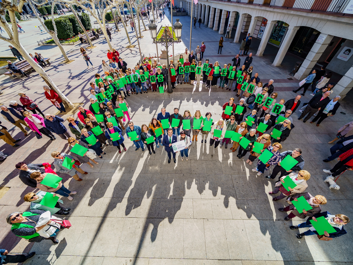 Torrejón de Ardoz se sumó a la conmemoración del Día Mundial contra el Cáncer con un gran lazo humano con el lema “Todos contra el cáncer”, en la Plaza Mayor como muestra de apoyo a quienes sufren esta enfermedad