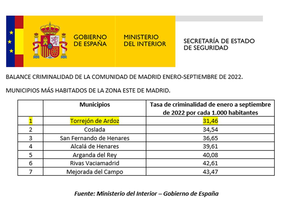 Torrejón de Ardoz, 18 de enero de 2023. Con una tasa de criminalidad de 31,46 delitos por cada mil habitantes, Torrejón de Ardoz fue la tercera ciudad de más 100.000 habitantes más segura de la región. Se trata de datos consolidados del Ministerio del Interior de enero a septiembre de 2022, proprocionados por los Cuerpos y Fuerzas de Seguridad del Estado. En ese periodo la ciudad torrejonera registró un total de 4.239 infracciones penales.