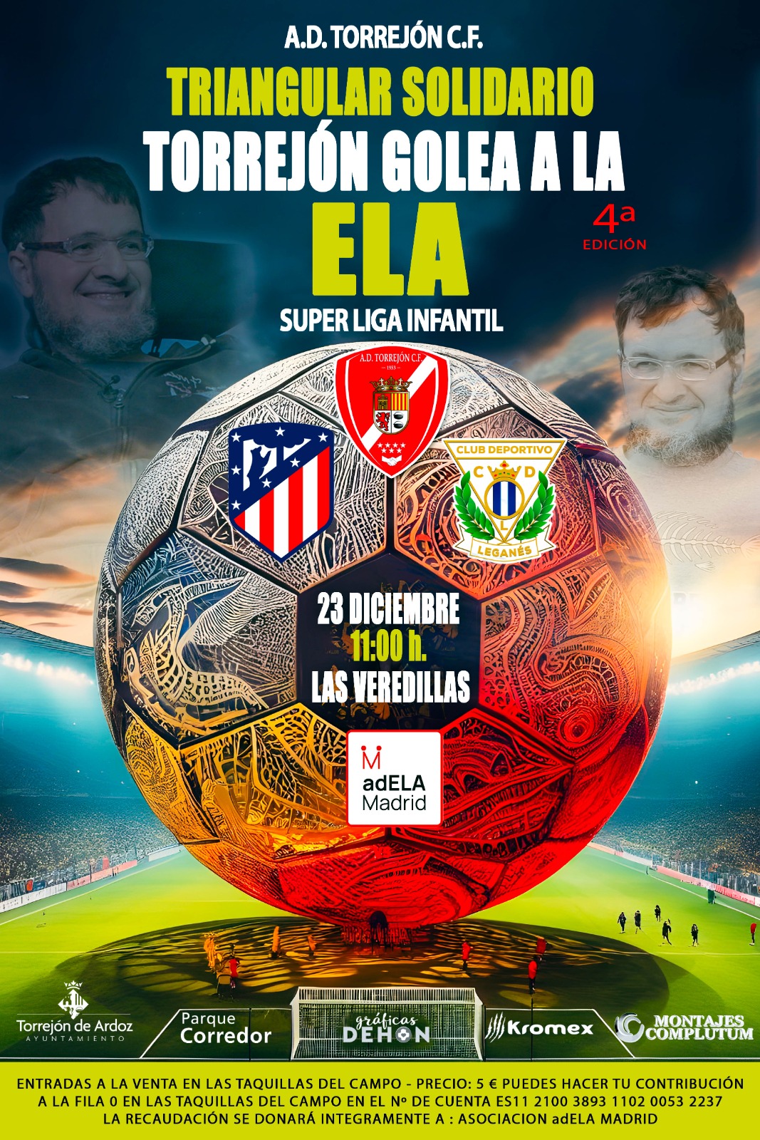 “Torrejón golea a la ELA”. Este es el lema del Triangular solidario de fútbol que se disputará mañana, sábado, 23 de diciembre, en el Campo de Fútbol Municipal Municipal Las Veredillas y que busca recaudar fondos para luchar contra la Esclerosis Lateral Amiotrófica (ELA). El torneo, en el que participarán los equipos infantiles de la AD Torrejón CF, Atlético de Madrid y CD Leganés comenzará a las 11:00 horas.