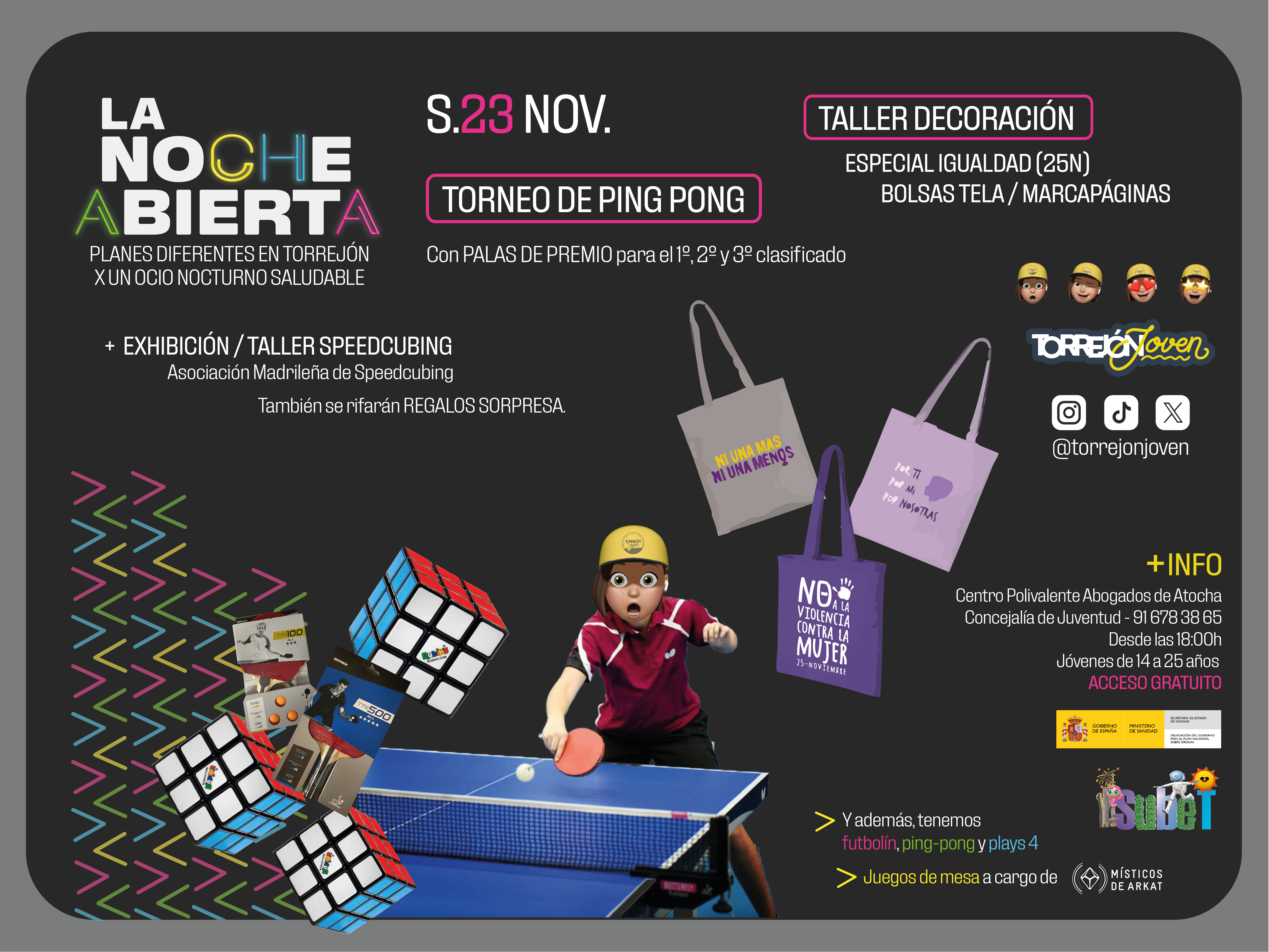 La Noche Abierta de mañana, sábado, 23 de noviembre, viene cargada de actividades para quedar con los amigos y compartir una tarde diferente, que combinará deporte, diversión y creatividad. Así, a partir de las 19:00 horas, los jóvenes que quieran podrán mostrar sus habilidades y competir por el título de campeón en un emocionante torneo de ping pong. Las inscripciones para el torneo podrán realizarse de 18:00 a 19:00 horas en el Centro Polivalente Abogados de Atocha, donde también se podrá disfrutar de futbolín, ping-pong, plays 4 y juegos de mesa a cargo de la Asociación Juvenil Místicos de Arkat. Además, habrá premios para el 1º, 2º y 3º clasificado. Pero hay más. Los amantes del speedcubing podrán deleitarse con una exhibición que dejará a todos boquiabiertos. Los talentosos cuberos, de la Asociación Madrileña de Speedcubing demostrarán su destreza y velocidad en la resolución de cubos Rubik. También se rifarán regalos sorpresa. Y aquí no acaba la cosa. Para aquellos que buscan dejar volar su creatividad, el taller de decoración, que se realizará con motivo del 25 de noviembre, Día Internacional contra la violencia de género, ofrecerá la oportunidad perfecta para aprender nuevas técnicas y decorar bolsas de tela y marcapáginas y llevarse a casa una obra única.