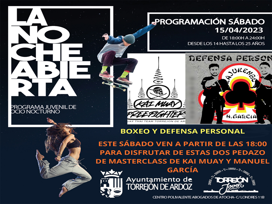 • Si te apetece liberar tensiones y estrés, además de aprender técnicas para poder defenderte ante una posible agresión, no te pierdas las Master Class de boxeo y defensa personal a cargo de Kai Muay Freefighter, y Manuel García, en el programa gratuito de ocio alternativo para jóvenes “La Noche Abierta”, mañana sábado, 15 de abril. La cita tendrá lugar a partir de las 18:00 horas en el Centro Polivalente Abogados de Atocha. También habrá juegos de mesa, a cargo de la Asociación Juvenil Místicos de Arkat, partidas de PS4, futbolín y ping-pong