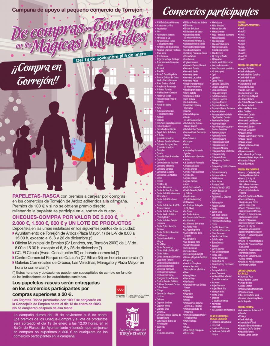 Continúa la campaña “De compras por Torrejón en las Mágicas Navidades” para apoyar al comercio de la ciudad y premiar a los clientes que realicen sus compras en alguno de los 367 establecimientos participantes. Hasta el próximo al 5 de enero de 2023 todos aquellos clientes que hagan compras superiores a 20 euros en cualquiera de los establecimientos suscritos a la campaña recibirán una tarjeta-rasca a través de la cual podrán optar a dos tipos de premios por un valor total de 9.800 euros.