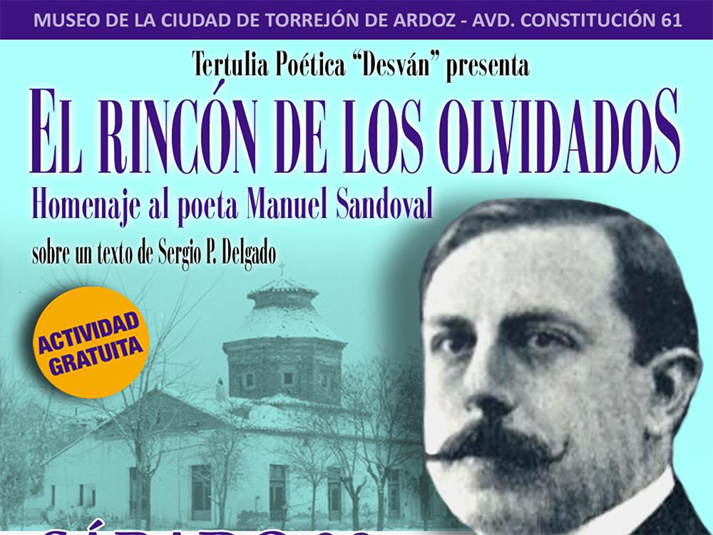 Vuelve la iniciativa cultural “Las Tardes del Museo” este el sábado 28 de septiembre con “El rincón de los olvidados”, un homenaje al poeta Manuel Sandoval sobre un texto de Sergio P. Delgado que organiza la Concejalía de Cultura del Ayuntamiento de Torrejón de Ardoz junto a la Tertulia Poética “Desván”. La cita tendrá lugar en el Museo de la Ciudad (avenida de la Constitución, 61) a las 18:30 horas con entrada gratuita hasta completar aforo.