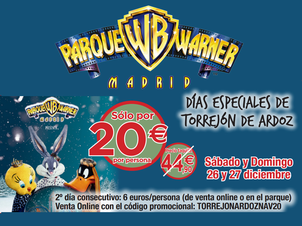 • La promoción continuará el sábado 26 y domingo 27 de diciembre en el Parque Warner y las entradas para los torrejoneros tendrán un precio de 20 euros, mientras que para el resto tienen un coste de 44,90 euros. Además, el segundo día consecutivo será de 6 euros por persona (de venta online o en el parque. La venta online con el código promocional TORREJONARDOZNAV20