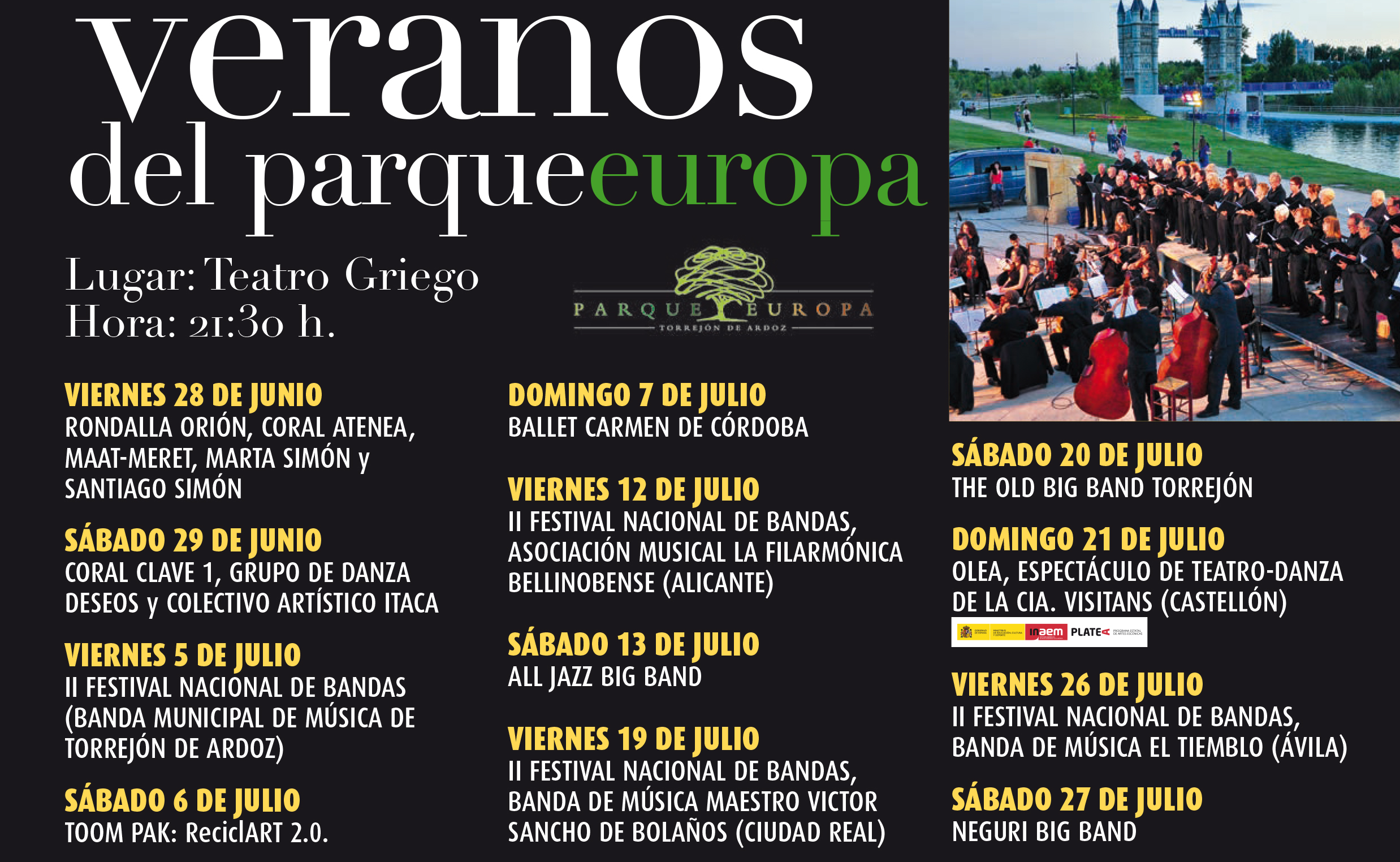 Mañana viernes 5 de julio arranca esta nueva edición de los “Veranos del Parque Europa” con el II Festival Nacional de Bandas que continuará el 12 de julio con la Asociación Musical La Filarmónica Benillobense (Alicante), el 19 de julio con la Banda de música Maestro Víctor Sancho de Bolaños (Ciudad Real) y el 26 de julio con la Banda de música El Tiemblo (Ávila).