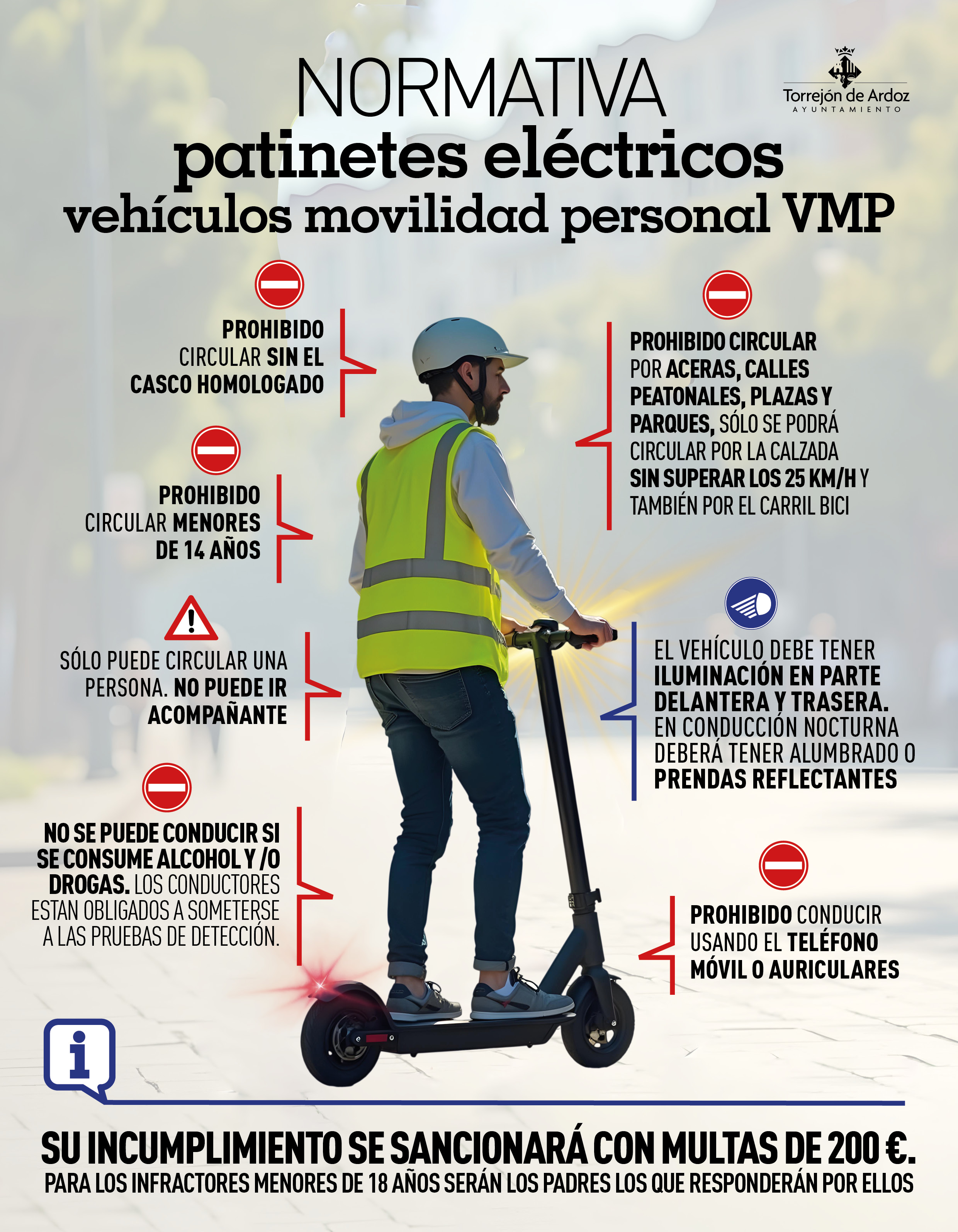 o Durante los meses de marzo y abril de 2025 la Policía Local de Torrejón de Ardoz apercibirá a los conductores que no cumplan estas normas y a partir del 1 de mayo se sancionarán con multas de 200 euros. Para los infractores menores de 18 años serán los padres los que responderán por ellos.